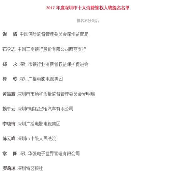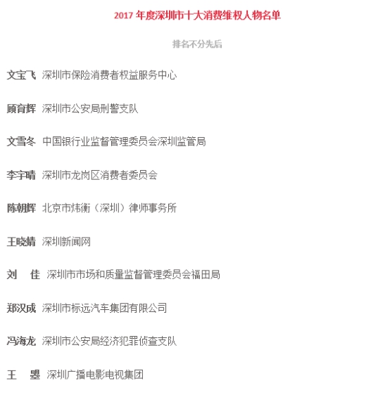 附:“2017年度深圳市十大最美消費(fèi)維權(quán)人物”名單(排名不分先后)