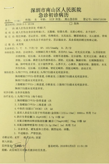 第二天,張女士立刻去深圳市南山區(qū)人民醫(yī)院急診科就診,初步診斷為“全身多處挫傷”。羅小姐說,“當(dāng)時的法醫(yī)鑒定結(jié)果是輕微傷,法醫(yī)鑒定貼好封條交給了派出所。”