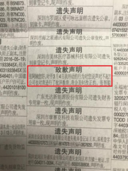報(bào)紙分類信息中的致歉聲明(第四條)