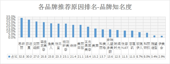排名第一的是思妍麗,品牌知名度推薦率為32.8%;其次是歐潔蔓,推薦率為30.0%;第三名是克麗緹娜,推薦率為27.0%。