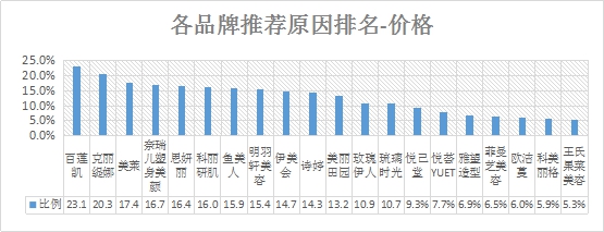 排名第一的是百蓮凱,價(jià)格推薦率為23.1%;其次是克麗緹娜,推薦率為20.3%;第三名是美萊,推薦率均為17.4% 。