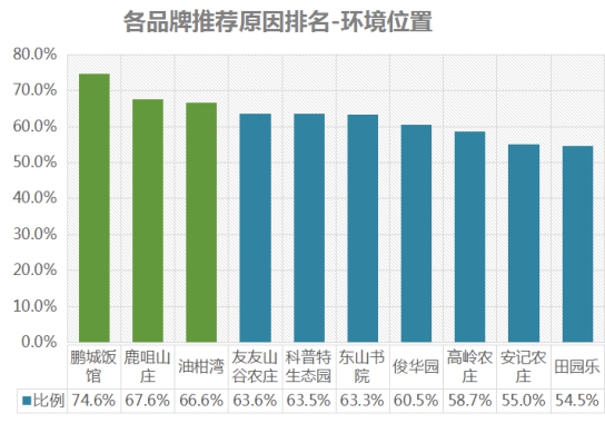 排名第一的是鵬城飯館,環(huán)境位置推薦率為74.6%;其次是鹿咀山莊,推薦率為67.6%;第三名是油柑灣,推薦率為66.6% 。