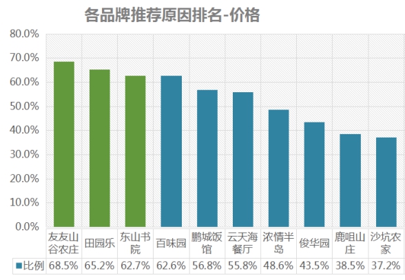 排名第一的是友友山谷農莊,價格推薦率為68.5%;其次是田園樂,推薦率為65.2%;第三名是東山書院,推薦率為62.7% 。