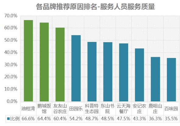 排名第一的是油柑灣,服務人員服務質量推薦率為66.6%;其次是鵬城飯館,推薦率為64.4%;第三名是友友山谷農莊,推薦率為60.4% 。