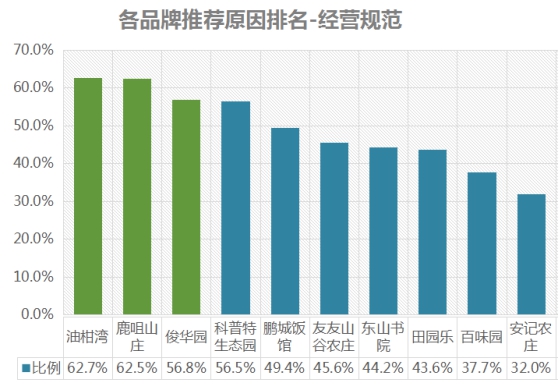 排名第一的是油柑灣,經營規(guī)范推薦率為62.7%;其次是鹿咀山莊,推薦率為62.5%;第三名是俊華園,推薦率為56.8%。