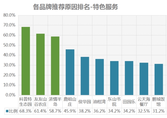 排名第一的是科普特生態(tài)園,特色服務推薦率為68.3%;其次是友友山谷農莊,推薦率為61.4%;第三名是濃情半島,推薦率為58.7% 。