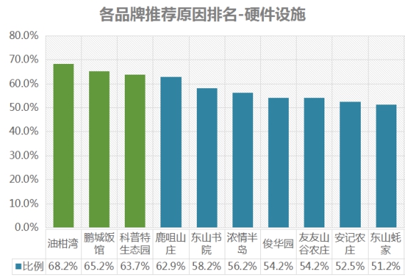 排名第一的是油柑灣,硬件設施推薦率為68.2%;其次是鵬城飯館,推薦率為65.2%;第三名是科普特生態(tài)園,推薦率為63.7% 。