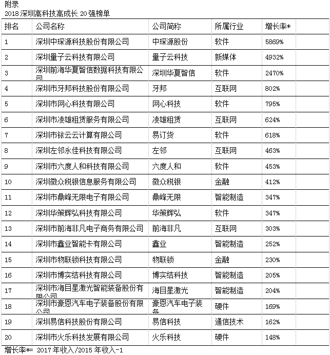 今年,榮登“深圳20強”三甲的獲獎企業(yè)分別為深圳中琛源科技股份有限公司、深圳量子云科技有限公司和深圳前海華夏智信數(shù)據(jù)科技有限公司,他們在過去三年中表現(xiàn)出的平均增長率分別為5,869%、4,932%和2,470%。本年度入選“深圳20強”的企業(yè)除了軟件、硬件、互聯(lián)網(wǎng)和通訊技術(shù)外,也不乏其他新興領(lǐng)域,如新媒體、智能制造和金融科技。此外,為表彰深圳市當(dāng)?shù)乇憩F(xiàn)優(yōu)秀且極具潛力的初創(chuàng)企業(yè),今年共有20家企業(yè)獲選“深圳明日之星”,它們來自多個不同的領(lǐng)域,包括人工智能、智能設(shè)備、電子商務(wù)、教育、生物醫(yī)藥、金融科技和互聯(lián)網(wǎng)平臺服務(wù)等 (詳見附錄)。獲選成為“深圳20強”和“深圳明日之星”的企業(yè),將自動成為“中國高科技高成長50強”(簡稱“中國50強”)和“中國明日之星”的候選企業(yè),并在今年11月與全國其他入圍企業(yè)角逐,躋身全國增長最快、最具發(fā)展?jié)摿Φ母呖萍计髽I(yè)之列。
