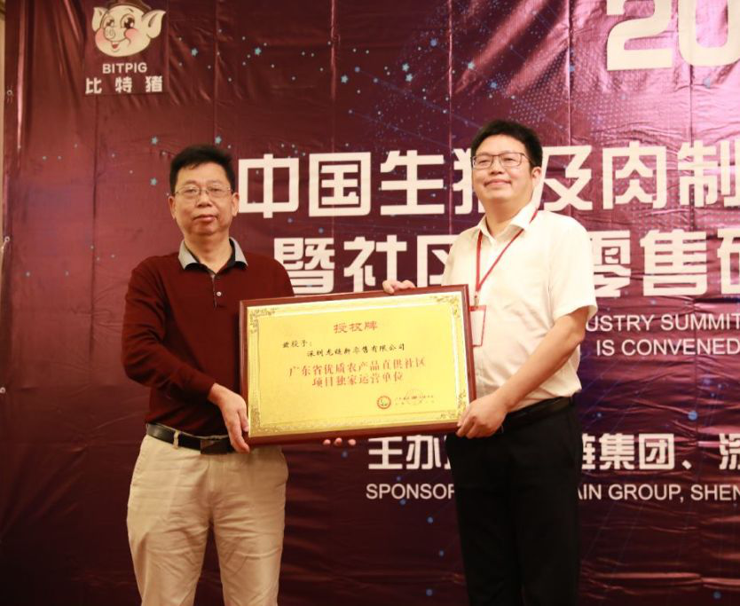 龍鏈集團(tuán)董事局主席、川豬集團(tuán)董事長、深圳龍鏈新零售有限公司董事長夏可,上臺接受了這項(xiàng)全廣東省獨(dú)家的授權(quán)牌,并發(fā)表感言:這既是廣東省委、省政府對深圳龍鏈新零售有限公司以區(qū)塊鏈、人工智能、物聯(lián)網(wǎng)等領(lǐng)域的高新科技,打造形成了生豬及肉制品等高品質(zhì)“菜籃子工程”系列產(chǎn)品的規(guī)?;I(yè)化產(chǎn)供銷及商業(yè)平臺服務(wù)“一條龍”的肯定,也是一種鞭策——鞭策龍鏈人將自創(chuàng)的“比特豬”品牌穩(wěn)固為中國高端健康食品結(jié)合社區(qū)新零售領(lǐng)域的第一品牌,并不斷推動市民能夠以更便捷的方式與更良好的消費(fèi)體驗(yàn),獲得高品質(zhì)的放心食品。