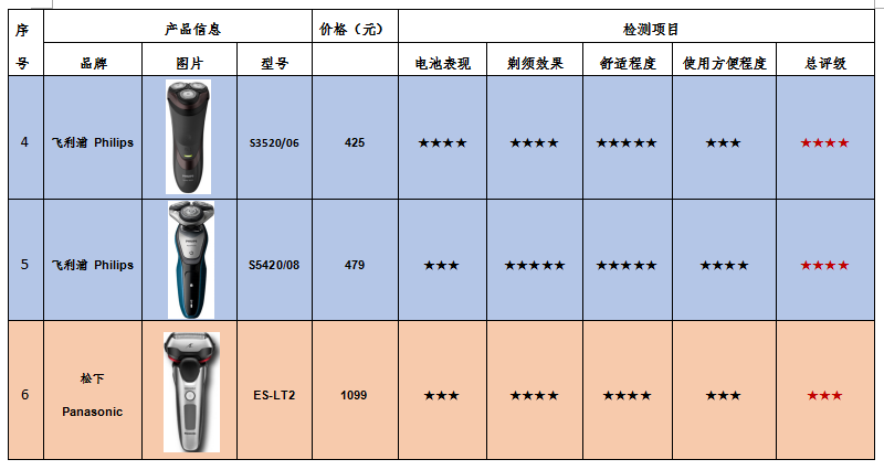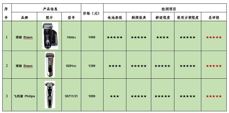附:ICRT電動剃須刀比較試驗(yàn)產(chǎn)品信息及綜合評級表