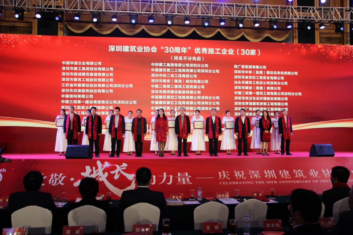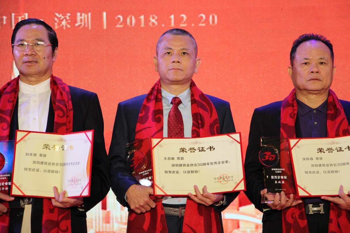 本次慶典上,深圳建筑業(yè)協(xié)會表彰了一批在促進、推動深圳建筑行業(yè)發(fā)展中作出重大貢獻的優(yōu)秀企業(yè)和個人,鼓勵他們不斷探索創(chuàng)新,共同創(chuàng)造深圳建筑業(yè)的輝煌。深圳市建被授予“30周年優(yōu)秀施工企業(yè)”;翠林投資集團董事長王忠明榮獲深圳建筑業(yè)協(xié)會“30周年優(yōu)秀企業(yè)家”稱號;深圳市建員工盧燦光、郝崇民榮獲“30周年優(yōu)秀項目經(jīng)理”稱號;深圳市建老員工李炳坤榮膺“30周年優(yōu)秀工匠”稱號。