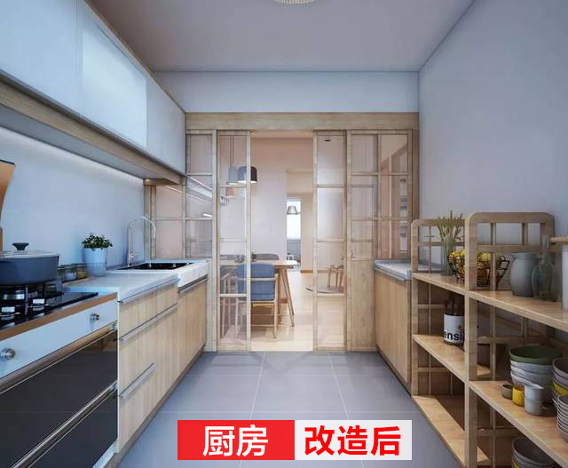 改造后的廚房干凈利索,各個(gè)功能區(qū)分明顯,木質(zhì)的隔板、柜子實(shí)用美觀,還利用玻璃移門分隔了廚房與外部。