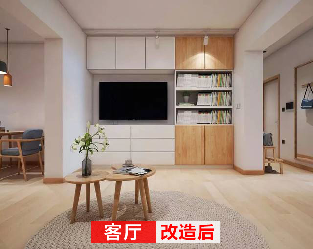 改造后的客廳同樣干凈簡潔,打造一面電視柜做儲(chǔ)物,抽屜+儲(chǔ)物柜+書柜的設(shè)計(jì),能夠滿足客廳的收納需求。
