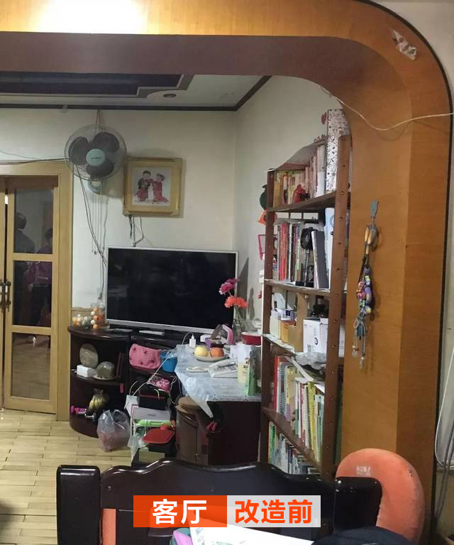 改造前客廳包了一個(gè)大門套,看起來不美觀,而且很笨重;客廳也放了一部分書,七七八八的東西塞在電視柜下,顯得客廳也是雜亂無章。