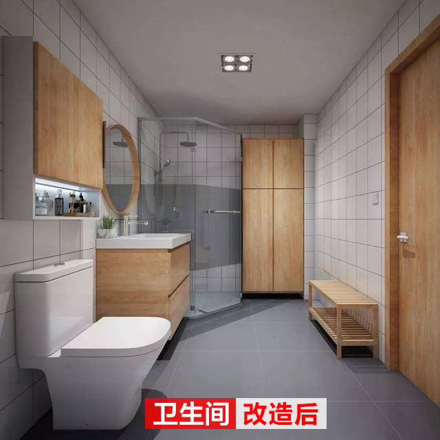 衛(wèi)生間面積還是不小的,在淋浴房旁做了一個(gè)儲(chǔ)物柜,放一些清潔物品,拖把等;馬桶上方的收納也利用起來,整個(gè)衛(wèi)生間的布局趨于合理。
