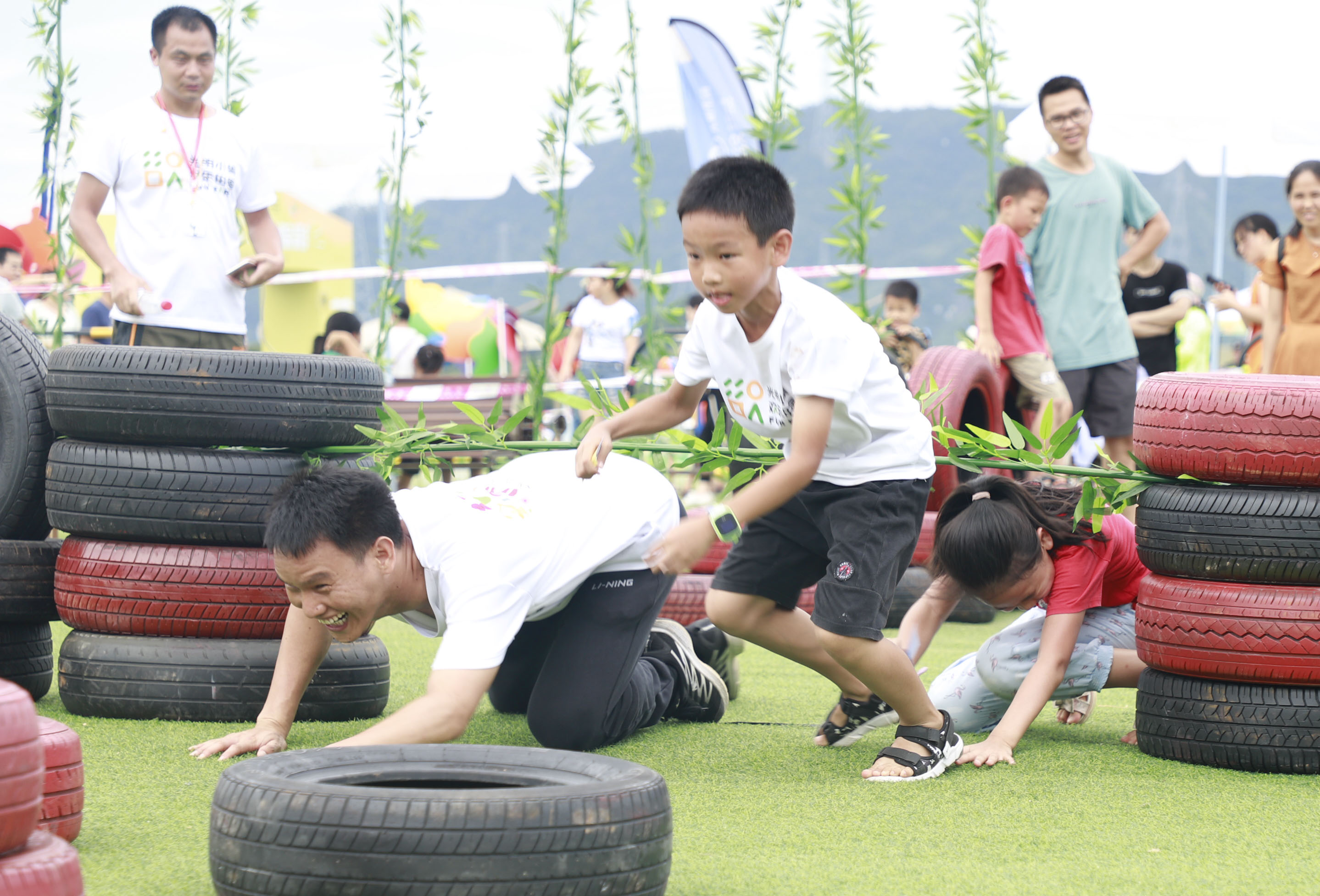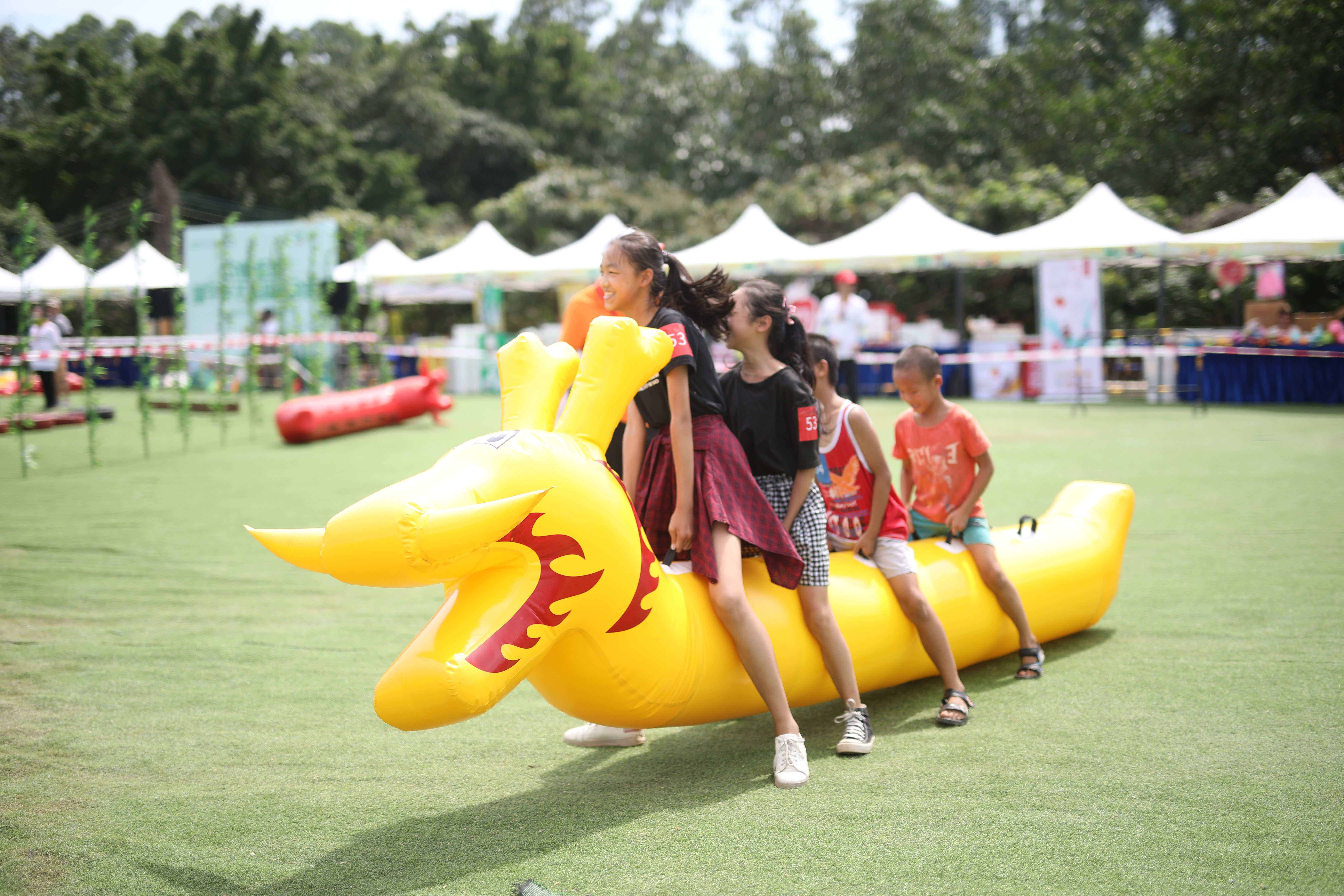 家長小朋友共騎在龍舟上用腳往前沖,有的隊伍步調(diào)一致,快速地奔向終點,贏得觀眾的齊聲喝彩而有的隊伍則踉踉蹌蹌,引起觀眾陣陣笑聲。