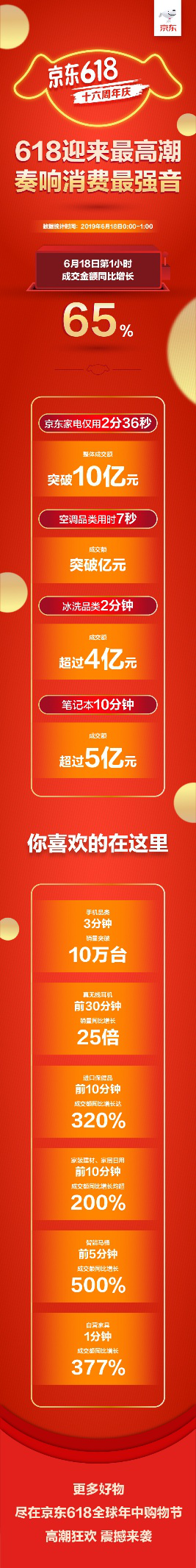 深圳新聞網(wǎng)2019年6月18日訊 6月18日零點的鐘聲猶如一聲清脆的發(fā)令槍,京東618十六周年慶迎來了18天中的下單最高潮,中國億萬消費市場的旺盛活力在這一刻盡情綻放,第一個小時的成交金額同比增長65%,京東在618這場席卷全民消費熱潮中的核心地位進(jìn)一步凸顯。