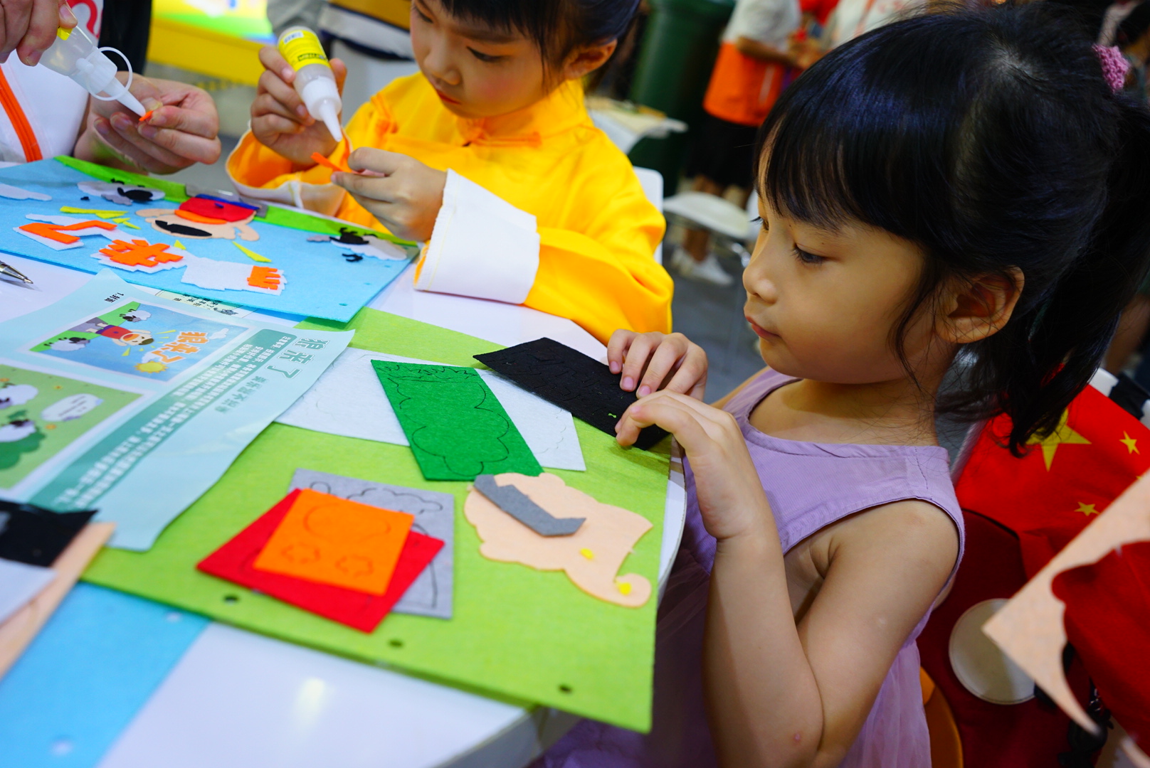 在“手工布書制作”體驗(yàn)區(qū),志愿者耐心地引領(lǐng)兒童制作專屬自己的一本不織布手工書,感受動手及閱讀帶來的另一種快樂。