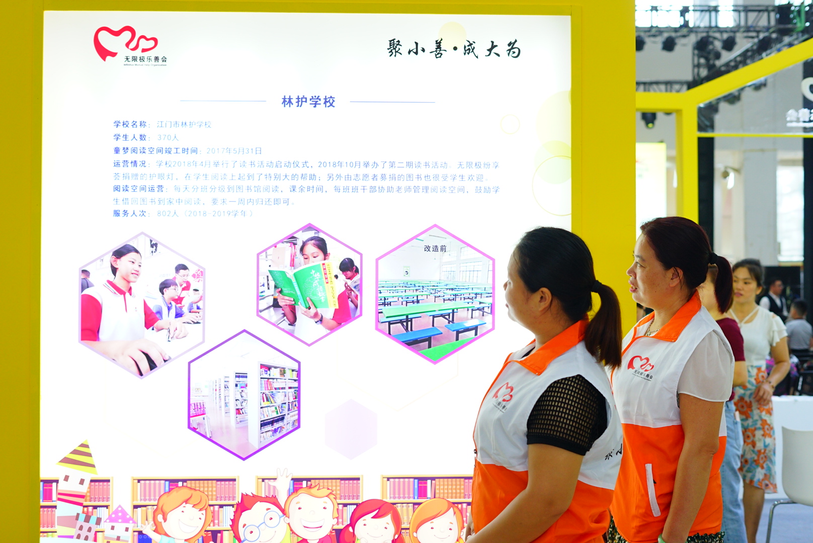 在南國書香節(jié)江門分會場的場館中央,“黃色小屋”尤其吸人眼球。在項(xiàng)目展示上,無限極樂善會多年來一直關(guān)注鄉(xiāng)村兒童的閱讀教育問題,自2015年起,攜手江門市相關(guān)政府部門發(fā)起了童夢閱讀空間公益項(xiàng)目,致力于兒童閱讀空間建設(shè)及校內(nèi)閱讀推廣工作。在展區(qū),可以看到五所童夢閱讀空間的運(yùn)營等基本情況。