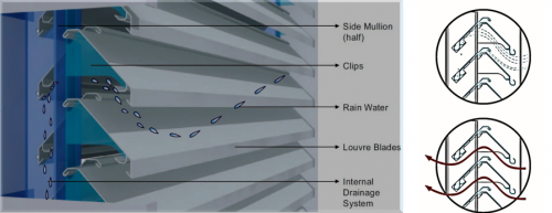 除了屋面幕墻的“防水神經(jīng)系統(tǒng)”,令人驚嘆的還有安裝在展館立面幕墻上的“人字形”百葉,這種雙片百葉同時(shí)具備50%“空氣通風(fēng)性能和95%防雨水性能。巧妙的“人字形”設(shè)計(jì),使得風(fēng)和雨水從百葉片間進(jìn)入時(shí),能夠保證空氣從向上傾斜的第一片百葉有效進(jìn)入,而雨水被第二片向下傾斜的百葉擋住,并由葉片分流至兩邊的豎框里,排出下邊框?!叭俗中巍卑偃~不僅能完全阻風(fēng)防雨,還具備超高強(qiáng)度,足以抵抗臺風(fēng)暴雨的侵襲。