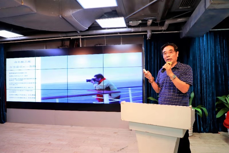 蘇偉老師在現(xiàn)場(chǎng)介紹:10月15日對(duì)深圳來說是一個(gè)極其不平凡的日子,上午在深圳舉辦了首屆“中國海洋第一展”暨“2019中國海洋經(jīng)濟(jì)博覽會(huì)”在深圳會(huì)展中心隆重開幕,下午由中國自主建造的首艘極地科學(xué)考察破冰船“雪龍2”號(hào)在蛇口港出發(fā)首航挺進(jìn)南極,特別機(jī)緣巧合的是我今晚分享的內(nèi)容就是南北極旅游。為什么用“畫”極地,而不是“話”極地,這是因?yàn)椋厍蛴腥龢O,除了南北極外,還有“珠峰”就是第三極。而我們?nèi)齻€(gè)六十年的老男人,在蘇偉老師的鼓動(dòng)下,三個(gè)人用不到三年的時(shí)間,踏訪了這“三極”。如果要展開講,恐怕三天三夜也講不完。所以,“畫”極地,就是用照片,講一下照片背后的故事。