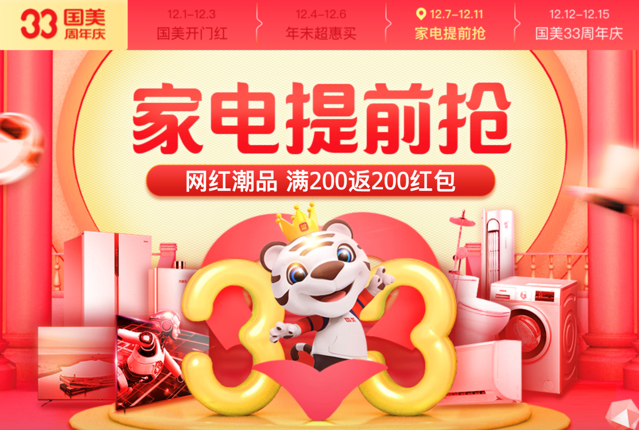 12月12日-14日,國美33周年“超級夜市”,線上商城、線下門店共赴一場“巔峰2小時”的盛宴。家裝、換新、添置新物件,所有的需求在國美一次滿足。