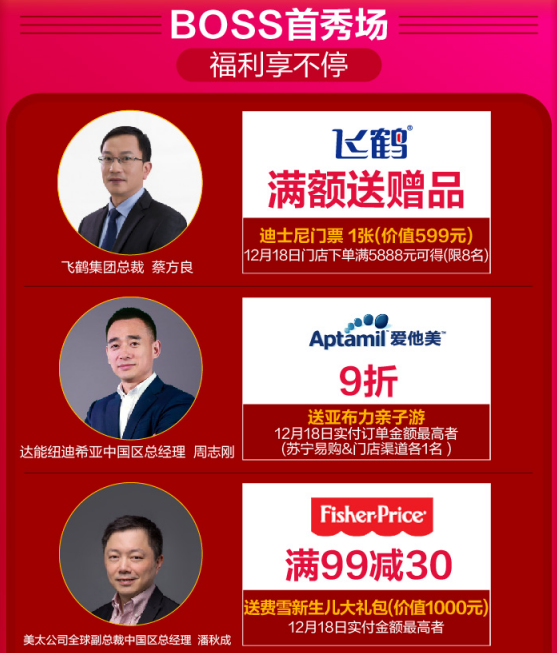 12月18日,蘇寧紅孩子打造了線上線下雙線齊發(fā)的“年終狂歡搶購盛典”。母嬰品牌大佬帶頭發(fā)福利,飛鶴集團總裁蔡方良、達能紐迪希亞中國區(qū)總經(jīng)理周志剛、美太公司全球副總裁中國區(qū)總經(jīng)理潘秋成、寶潔大中華區(qū)幫寶適副總裁任遠,金佰利大中華區(qū)董事總經(jīng)理Mike等豪送價值十萬大禮?;顒赢?dāng)天,購相應(yīng)品牌產(chǎn)品且實付金額最高者就能將戴森吹風(fēng)機、老鳳祥黃金、迪士尼門票等大禮免費帶回家。