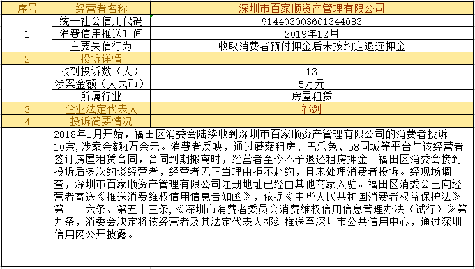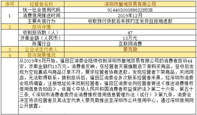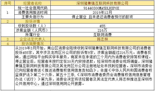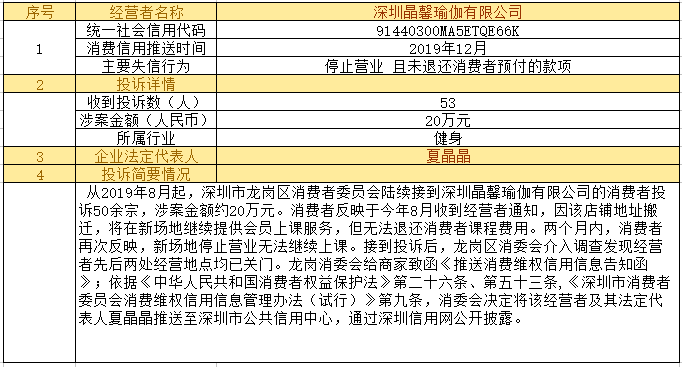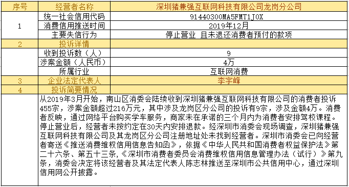 深圳新聞網(wǎng)2019年12月24日訊12月24日,為加強對商品和服務(wù)的社會監(jiān)督,推進(jìn)消費領(lǐng)域信用體系建設(shè),深圳市消費者委員會(以下簡稱“深圳市消委會”)聯(lián)合福田區(qū)消費者委員會(以下簡稱“福田區(qū)消委會”)和龍崗區(qū)消費者委員會(以下簡稱“龍崗區(qū)消委會”)將深圳豬兼強互聯(lián)網(wǎng)科技有限公司、深圳市皇域貿(mào)易有限公司、深圳市百家順資產(chǎn)管理有限公司、深圳市予恩美容美發(fā)有限公司、深圳晶馨瑜伽有限公司等五家預(yù)付式和互聯(lián)網(wǎng)消費領(lǐng)域停止?fàn)I業(yè)且未退還消費者預(yù)付款項的經(jīng)營者及其主要負(fù)責(zé)人推送至深圳市公共信用中心,通過深圳信用網(wǎng)公開披露。