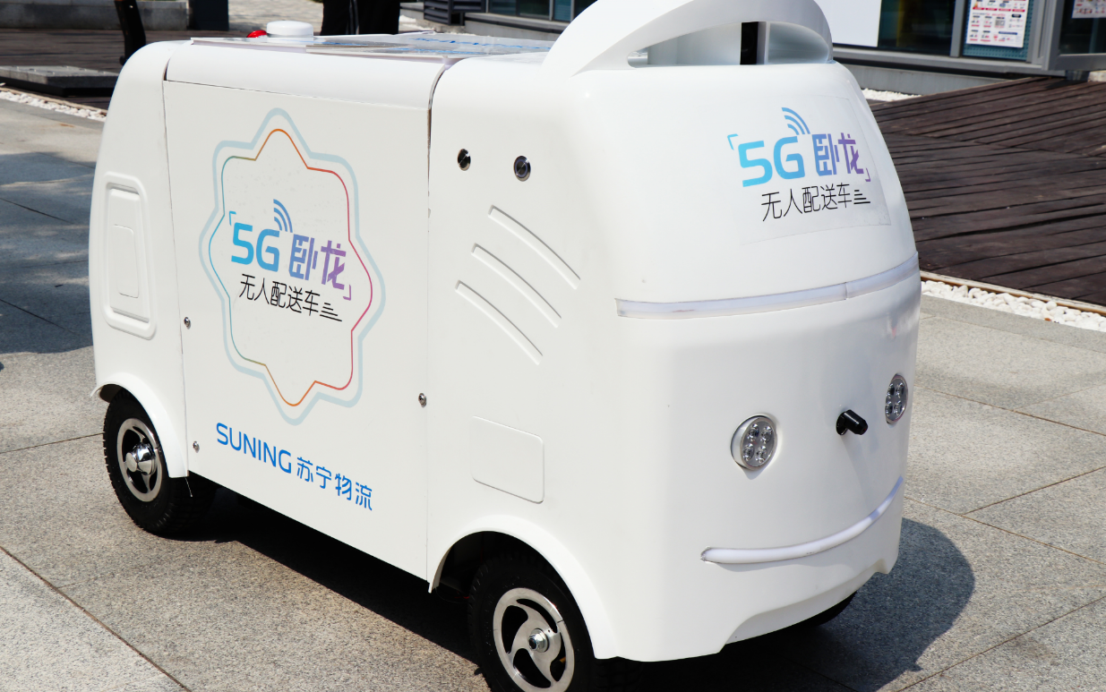 (圖:2019年8月17日,蘇寧物流5G“臥龍一號”無人配送車在南京實測成功 )