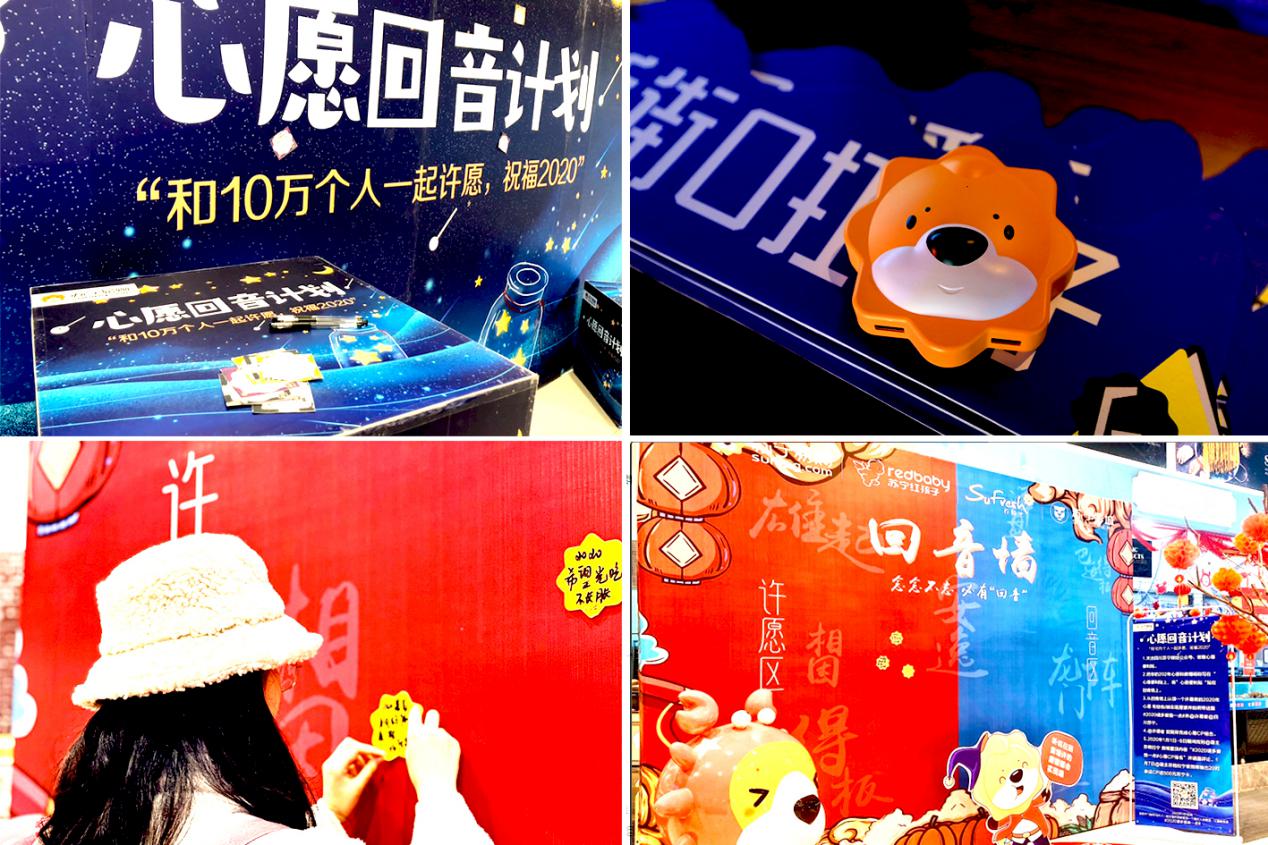 “心愿回音計劃”率先在南京徐莊園區(qū)啟動,蘇寧小店搭建起巨大的許愿瓶,瓶身通體為湛藍色,在藍色的背景中猶如海上漂流,并且內置數(shù)不清的心愿球,許愿者可以在心愿球上寫出個人心愿,投回許愿瓶后等待圓夢,將會“和10萬個人一起許愿,祝福2020”。
