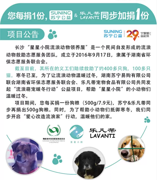 要說本次暖心活動(dòng)最受關(guān)注的,還屬蘇寧線上線下聯(lián)動(dòng)發(fā)起的“愛心狗糧7.9元捐”活動(dòng)。活動(dòng)期間,愛心人士只需要以7.9元的折扣價(jià),在蘇寧易購線上購買一斤樂凡蒂狗糧就可完成捐贈。同時(shí),蘇寧和樂凡蒂將加捐1斤。相當(dāng)于7.9元捐贈兩斤狗糧。而這些愛心狗糧,將直接發(fā)往長沙“星星小院流浪動(dòng)物領(lǐng)養(yǎng)屋”。