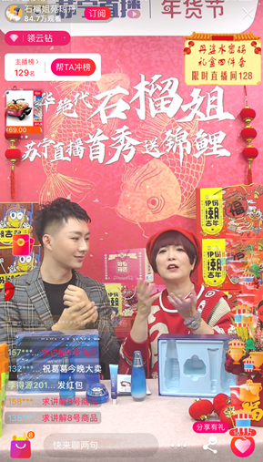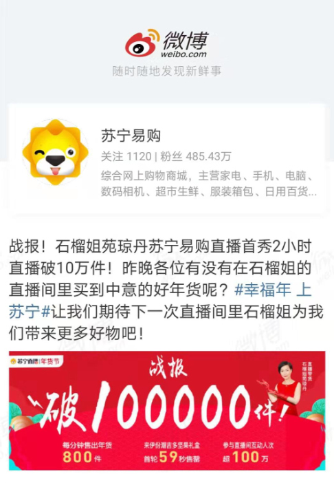 2020年伊始,“風(fēng)華絕代”的石榴姐苑瓊丹在蘇寧易購開始了新年帶貨直播首秀,為全網(wǎng)用戶推薦實(shí)用年貨,超過100萬人“圍觀”了直播,兩小時帶貨超10萬件,平均每分鐘售出800件年貨,其中最受消費(fèi)者歡迎的來伊份潮吉多堅(jiān)果禮盒59秒售罄,創(chuàng)下2020年明星帶貨的新記錄!