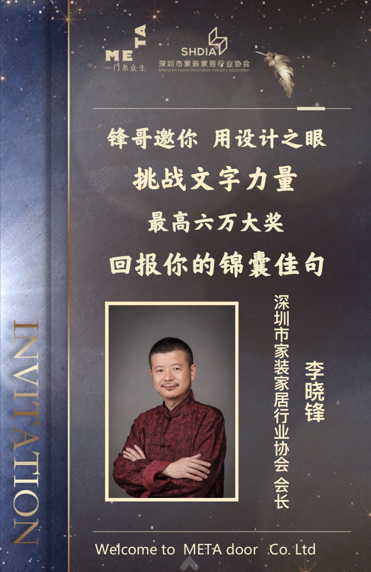 本次活動是深圳市家裝家居行業(yè)協會繼打造業(yè)內第一個門店設計邀請賽后,策劃的又一件引起行業(yè)轟動的事情。深圳市家裝家居行業(yè)協會李曉鋒會長邀請全國家居設計師一起玩“跨”界——為曼特門業(yè)設計廣告推廣語。本次邀請賽也是業(yè)內首次面向設計師群體的推廣語征集活動,曼特門業(yè)將用六萬大獎回報設計師的錦囊佳句。
