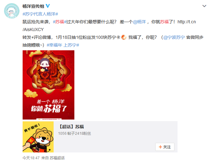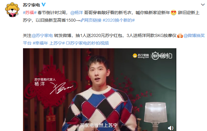 蘇寧代言人楊洋和江疏影也給大家?guī)?lái)了不少福利,粉絲們繼續(xù)喊話愛(ài)豆,“過(guò)年就差一個(gè)楊洋了,萬(wàn)一實(shí)現(xiàn)了呢”。蘇寧家電直接開(kāi)啟鼠運(yùn)來(lái)襲模式,粉絲參與微博互動(dòng),就有機(jī)會(huì)獲得2020元蘇寧紅包,還能獲得楊洋同款SKG按摩儀。