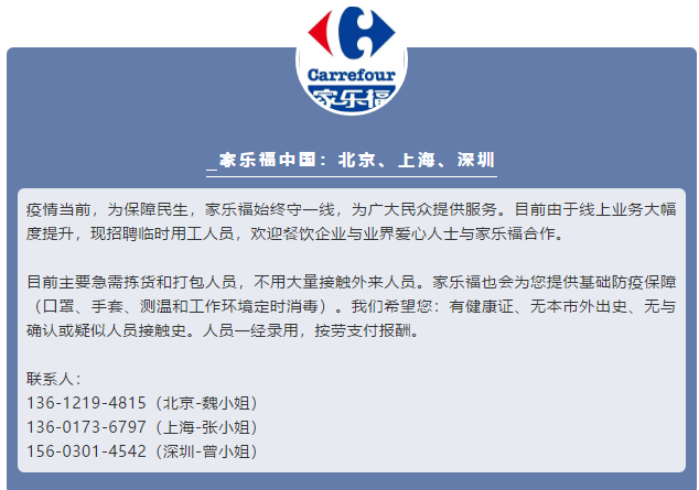 此外,家樂福還向全社會(huì)發(fā)出召集,以北京、上海、深圳為重點(diǎn)城市,希望社會(huì)暫時(shí)性歇業(yè)人員能夠前來上崗,主要工作職責(zé)為線上業(yè)務(wù)的揀貨、打包,不用大量接觸外來人員。家樂福將提供快速上崗培訓(xùn),包括個(gè)人安全衛(wèi)生和防護(hù)、顧客服務(wù)和崗位技能培訓(xùn),以及基礎(chǔ)防疫保障。