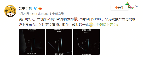 今晚21點多款華為新品將在蘇寧直播重磅亮相,除了新品發(fā)布外,蘇寧直播還將進(jìn)行開箱直播,讓用戶直觀感知到華為Mate Xs折疊屏產(chǎn)品。