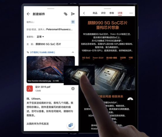 Mate Xs采用8英寸顯示屏,分辨率為2480×2200,折疊時(shí),屏幕尺寸為6.6英寸,分辨率為2480×1440。展開(kāi)狀態(tài)下,華為Mate Xs充分發(fā)揮突破視野的視覺(jué)空間優(yōu)勢(shì),在瀏覽視頻、開(kāi)啟閱讀、使用導(dǎo)航以及游戲影音時(shí),將獲得前所未有的視覺(jué)極限與沉浸體驗(yàn)。此外,通過(guò)智慧分屏模式,可以同時(shí)顯示、運(yùn)行多個(gè)應(yīng)用程序,多窗口交互提升應(yīng)用體驗(yàn)及操作效率。這種智慧分屏模式提供平行視界、跨屏拖拽、懸浮窗、分屏快捷欄等高頻使用場(chǎng)景智慧生態(tài)操作。