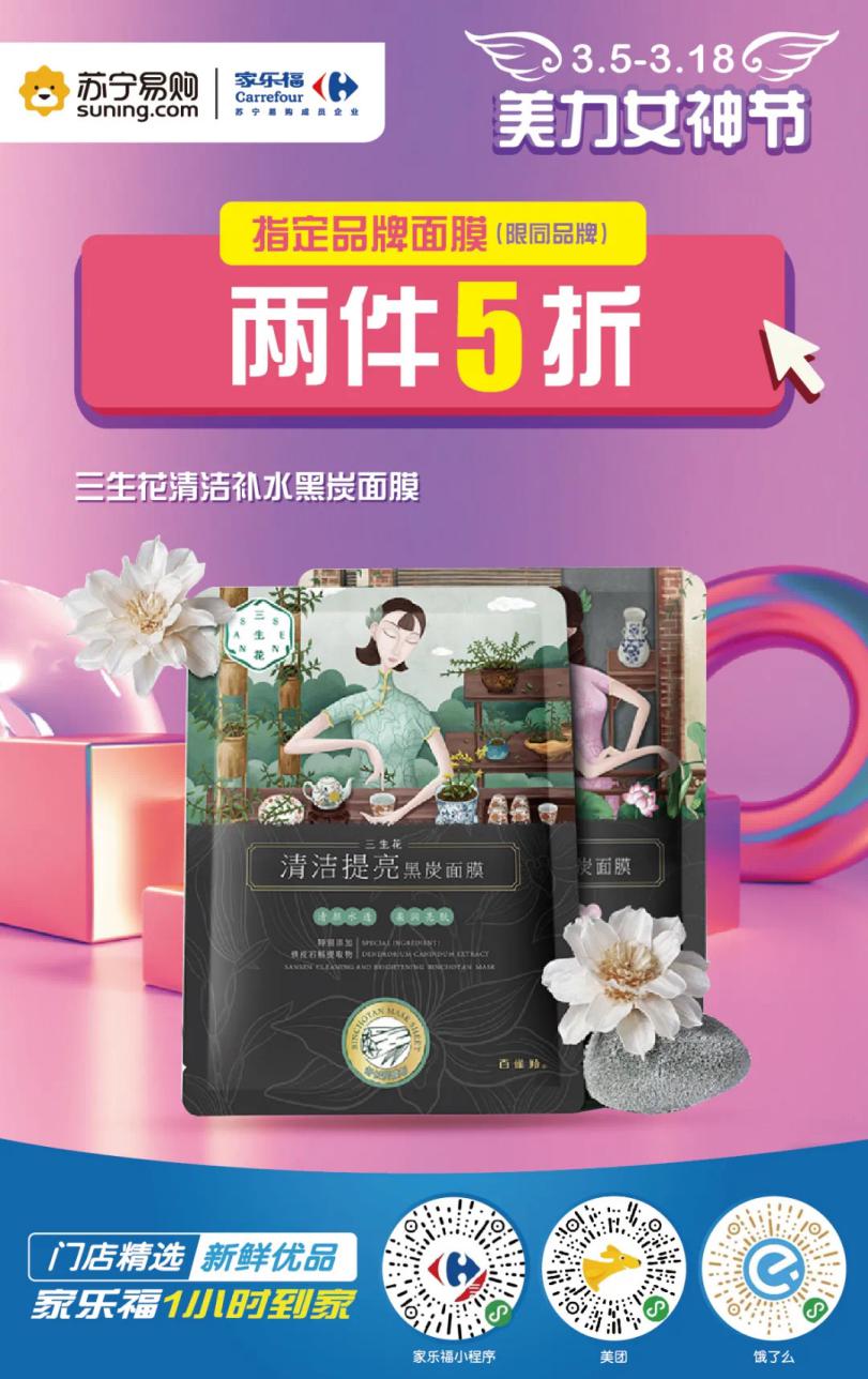此外,3月5日至3月18日,指定品牌面膜兩件5折,一鍵下單,家樂福“碼”上送到家。