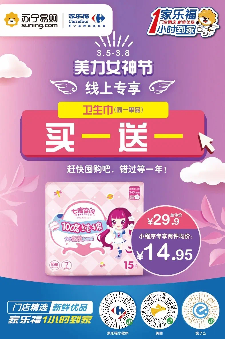 當(dāng)然,家樂福也一直在線,給你們送上儀式感節(jié)日福利。3月5日至3月8日,家樂福美“力”女神節(jié)熱辣來襲。家樂福小程序、蘇寧易購(gòu)APP、蘇寧小店APP、美團(tuán)外賣和餓么了五大線上平臺(tái)“火力全開”,讓你的美麗一直營(yíng)業(yè)不打烊。