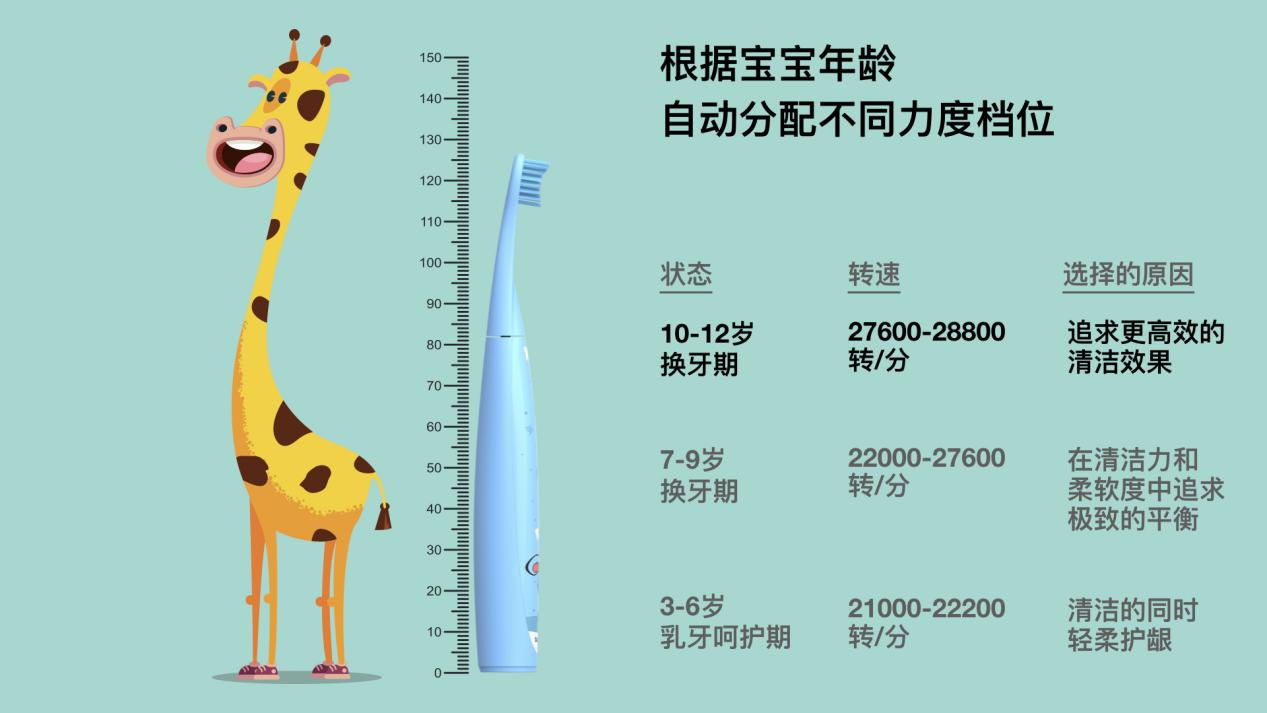 根據(jù)孩子的乳牙期、換牙期以及相應(yīng)年齡段特點(diǎn),S7000K可以自動(dòng)分配不同的轉(zhuǎn)速力度檔位功能,分階呵護(hù),讓孩子刷牙放心無(wú)憂。