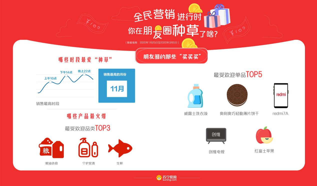 深圳新聞網(wǎng)2020年3月10日訊 線上買菜、線上看病、直播上課、遠(yuǎn)程健身……“宅經(jīng)濟(jì)”爆發(fā),使得社群私域流量積累的能量進(jìn)一步凸顯,全民營(yíng)銷成為新風(fēng)口。近日,蘇寧易購(gòu)發(fā)布全民營(yíng)銷大數(shù)據(jù),2020年1月25日至3月5日,蘇寧推客買家數(shù)和賣家數(shù)分別突破千萬、百萬大關(guān),80后成為朋友圈買、賣“雙主力”,糧油休食、個(gè)護(hù)家清、生鮮等產(chǎn)品成為最受歡迎的消費(fèi)品類。