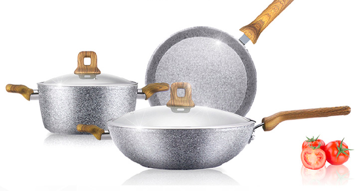 滿足炒、煎、燉多種需求,一套高品質(zhì)、高顏值的鍋具相信你一定不會(huì)拒絕。三禾鍋具三件套 T606是膳石犀利花崗巖健康不粘鍋,采用花崗巖納米起點(diǎn),不粘更持久,耐磨性更高,堪稱(chēng)品質(zhì)首選。除此之外,其還擁有五層技術(shù)工藝,并采用一體成型設(shè)計(jì),質(zhì)量顏值雙升級(jí)。原木紋手柄,防霉防燙;鋼化玻璃蓋,密封防溢;節(jié)能復(fù)合底受熱均勻。三件套內(nèi)包含炒鍋、煎鍋、燉鍋。
