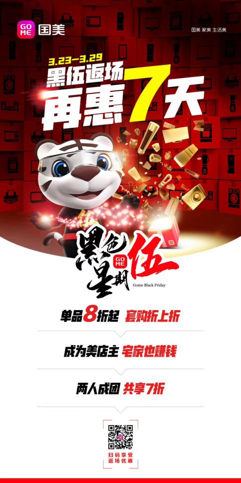據(jù)了解,3月23日-3月29日,國(guó)美零售“黑伍”返場(chǎng),再惠7天。在此期間,國(guó)美多種優(yōu)惠玩法悉數(shù)上線。用戶將不僅享受單品8折起、套購(gòu)折上折的優(yōu)惠,成為美店主,還能宅家賺錢(qián),享受商品返利。此外,還有兩人成團(tuán),共享7折等,快來(lái)國(guó)美美店廚飲專(zhuān)場(chǎng)選購(gòu)吧。