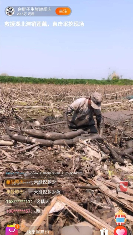 除了湖北的縣長、市長外,普通的湖北商戶不甘落后。8日上午,荊州洪湖的陽光明媚,“余胖子生鮮旗艦店”的店主便打開手機(jī)接通了直播,樸實的農(nóng)民性格讓他面對鏡頭一時不知該說什么好,簡單問好后,他就轉(zhuǎn)身下了塘,開始從厚重的泥土里拔出一根根新鮮的蓮藕。有不少00后網(wǎng)友是第一次見到挖藕的過程,他們發(fā)現(xiàn)原來潔白爽口的大藕居然是從泥中挖出來的,“挖藕真的太不容易了,一個上午要泡在塘泥里?!?/p>