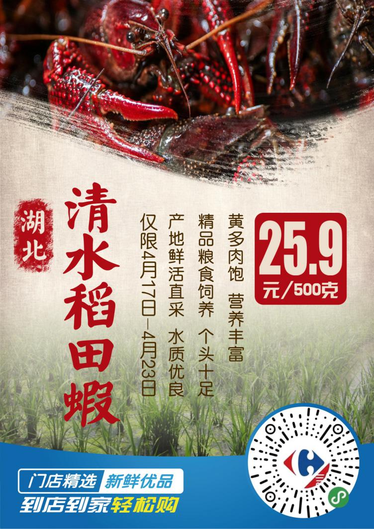 15號(hào)開始捕撈的這批湖北“清水稻田蝦”將于16號(hào)完成分揀裝車,發(fā)往家樂福全國(guó)各地大倉,17號(hào),家樂福位于北京,上海、哈爾濱,長(zhǎng)沙,成都,昆明,廣州,深圳等地的155家門店鮮活開售,恰逢家樂福418購(gòu)物節(jié),嘗鮮價(jià)低到25.9元/500克(僅限4月17日至23日)。同時(shí),顧客還可以通過家樂福小程序、蘇寧易購(gòu)app、蘇寧小店App、及美團(tuán)、餓了么下單,享受1小時(shí)送到家的極致“鮮“體驗(yàn)。