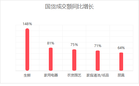“五一”小長假期間,國產(chǎn)商品的成交額同比增長了52%。國產(chǎn)的生鮮產(chǎn)品十分豐富,農(nóng)產(chǎn)品觸網(wǎng)利用信息經(jīng)濟快速的將地方市場轉(zhuǎn)化為全國市場,成交額同比增長了148%。此外,國產(chǎn)的家電、農(nóng)資園藝、清潔用品及廚具的成交額同比增長較高。
