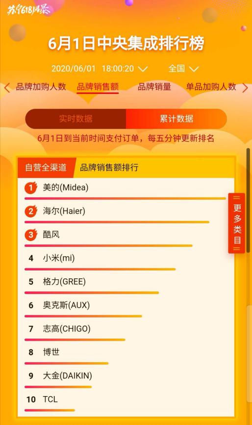 在蘇寧悟空榜,家電板塊火拼激烈,頭部品牌在蘇寧全渠道銷售暴增。截至6月1日18時,美的摘得家用空調(diào)及中央集成全渠道銷售額冠王,同時橫跨多品類品牌TOP榜,成為最大贏家。