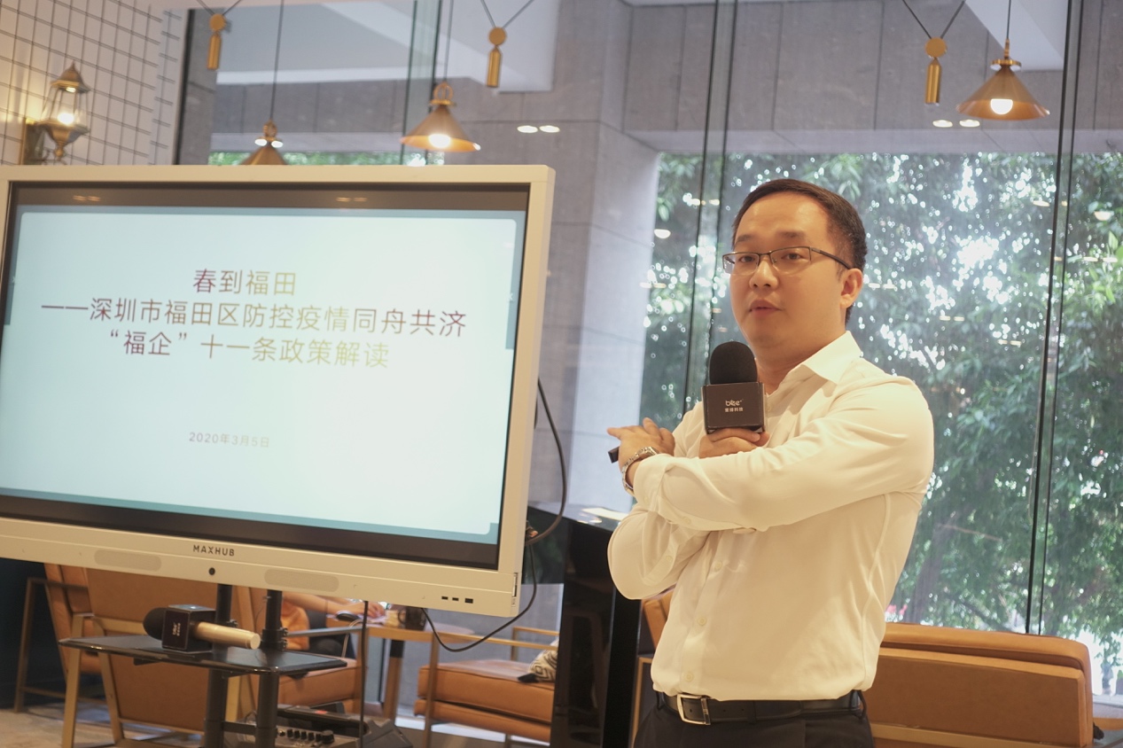 深圳市福田區(qū)財(cái)政局副局長林俊駒在分享會(huì)上指出,作為深圳最早研究提出企業(yè)復(fù)工復(fù)產(chǎn)的政府部門,深圳市福田區(qū)財(cái)政局第一時(shí)間啟動(dòng)了應(yīng)急資金撥付機(jī)制和應(yīng)急政府采購機(jī)制,并快速印發(fā)工作指引,加強(qiáng)對各預(yù)算單位的業(yè)務(wù)指導(dǎo),以及對各單位和各區(qū)資金撥付的保障。據(jù)不完全統(tǒng)計(jì),在疫情發(fā)生以來,深圳市福田區(qū)政府共投入4億多元疫情防控物資購置及醫(yī)療救治經(jīng)費(fèi)等方面。在此次分享會(huì)上,面向入駐在BEEPLUS深圳財(cái)富大廈空間的企業(yè)會(huì)員,林俊駒副局長為與會(huì)企業(yè)解讀了福田區(qū)“福企”11條及新“福企”10條政策,強(qiáng)調(diào)區(qū)政府又另行投入10億支持福田區(qū)企業(yè)克疫前行。他表示,在未來,福田區(qū)政府將繼續(xù)為創(chuàng)新創(chuàng)業(yè)類企業(yè)提供強(qiáng)有力的政策支撐,加大支持力度。