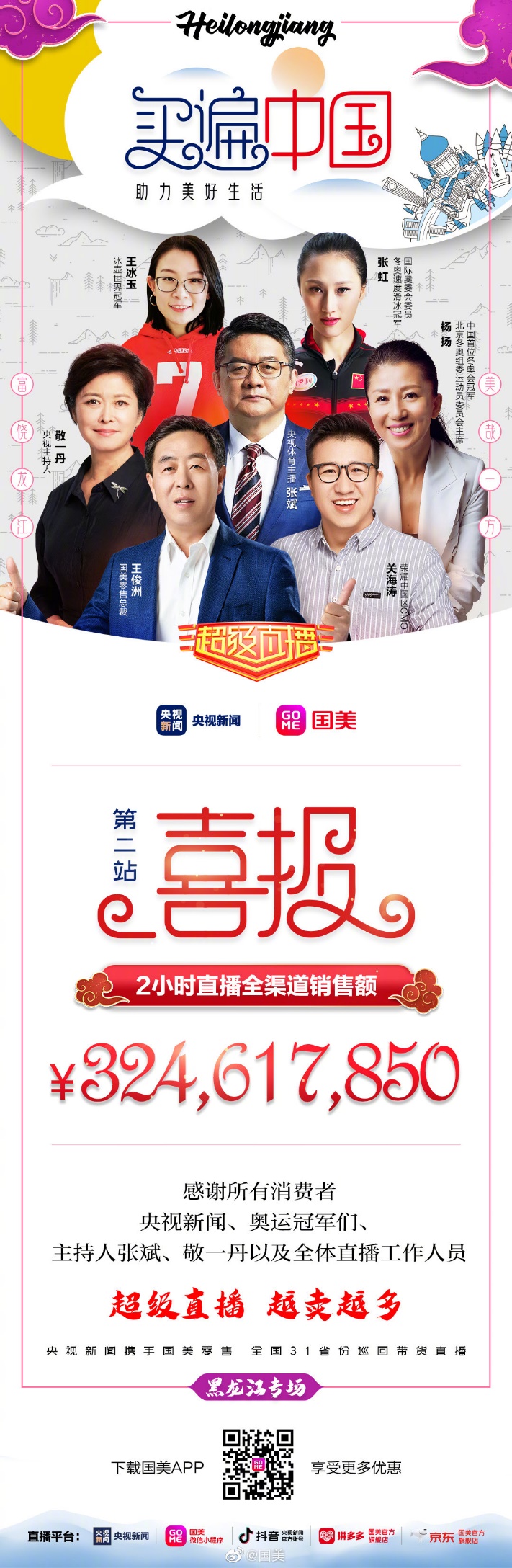 見圳客戶端·深圳新聞網(wǎng)2020年8月4日訊 群星閃耀,再創(chuàng)佳績!7月31日晚20點(diǎn),“買遍中國·助力美好生活”全國31省份巡回帶貨直播黑龍江專場以3.25億的銷售額收官。出生于黑龍江的中央電視臺著名主持人敬一丹與黑龍江籍冬奧冠軍楊揚(yáng)、張虹、王冰玉共同組成“龍江四美”,與央視體育頻道主持人張斌一起,展現(xiàn)了黑龍江歷史文化、鄉(xiāng)土風(fēng)情,介紹了生態(tài)農(nóng)業(yè)發(fā)展,也推薦了諸多美食與好物,并為北京冬奧會助力加油!