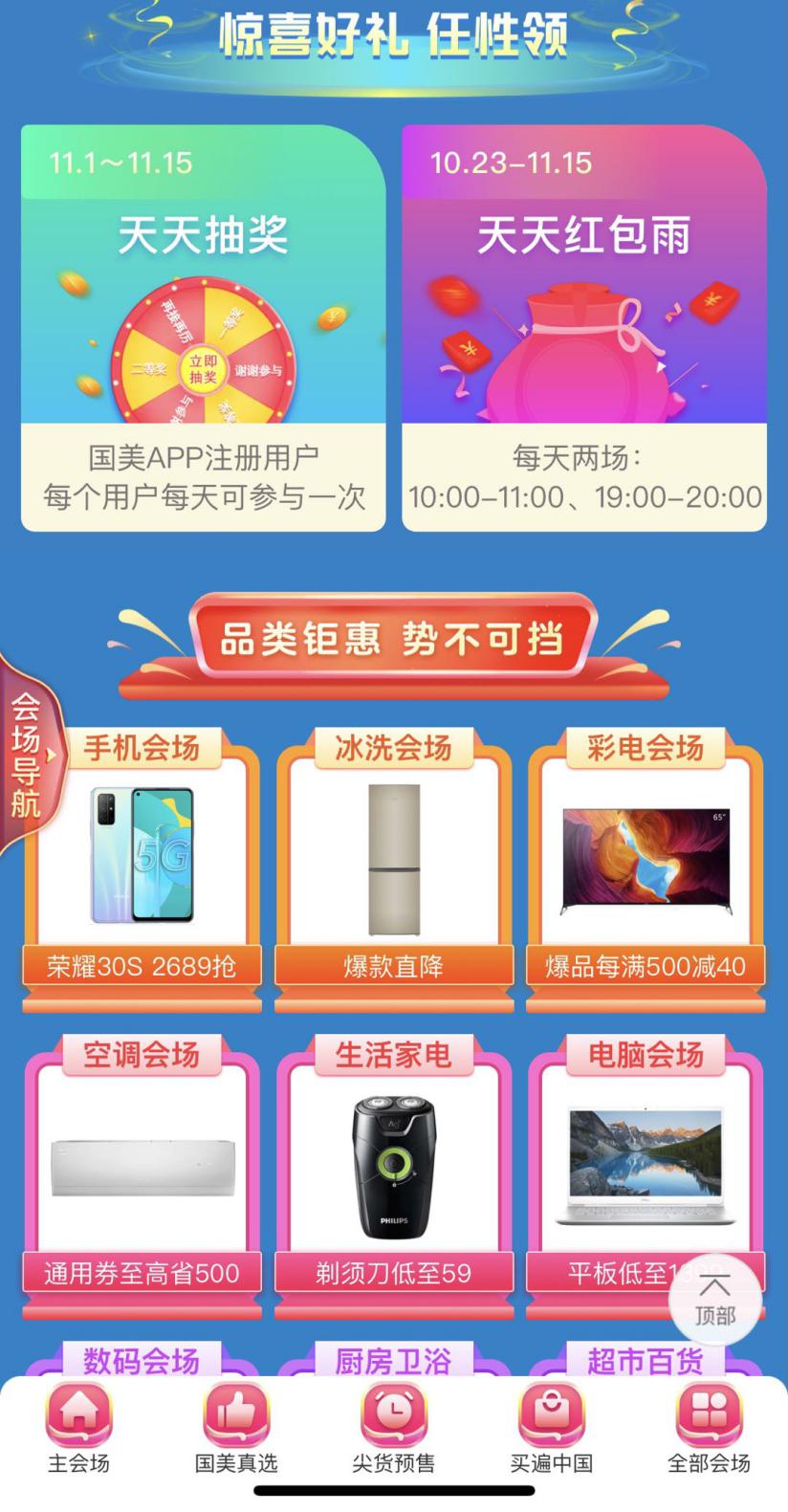 10月28日至11月25日,國美九九會員上線,只需九塊九,羊毛就能薅到手;10月30日,“買遍中國”直播杭州站開播,西湖美食便宜還好吃;11月1日-11月3日大促高峰啟動,各種紅包雨抽獎嗨不停;11月4日至11月6日,萬人直播,空前視覺盛宴奉上;11月7日至11月10日,買遍歐洲直播活動,全球好物任你挑;后續(xù)還有返場福利等你來拿!